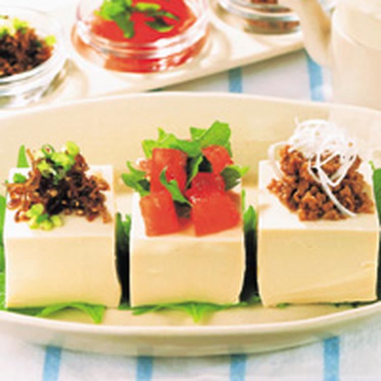 【ぴり辛ひき肉】フライパンにごま油を入れて熱し、豚ひき肉を炒める。パラパラにほぐれたら、豆板醤、Bの順に加えて炒め合わせる。奴にのせ、白髪ねぎをあしらう。