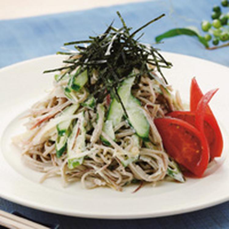 (1)の野菜と茹でたそば麺に(3)を混ぜ、お好みで塩で味をととのえ、トマトを添える。
