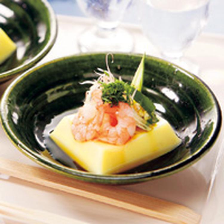 器に市販の卵豆腐を盛り付け、(1)、(2)の食材を彩り良く飾り、タレを回しかける。