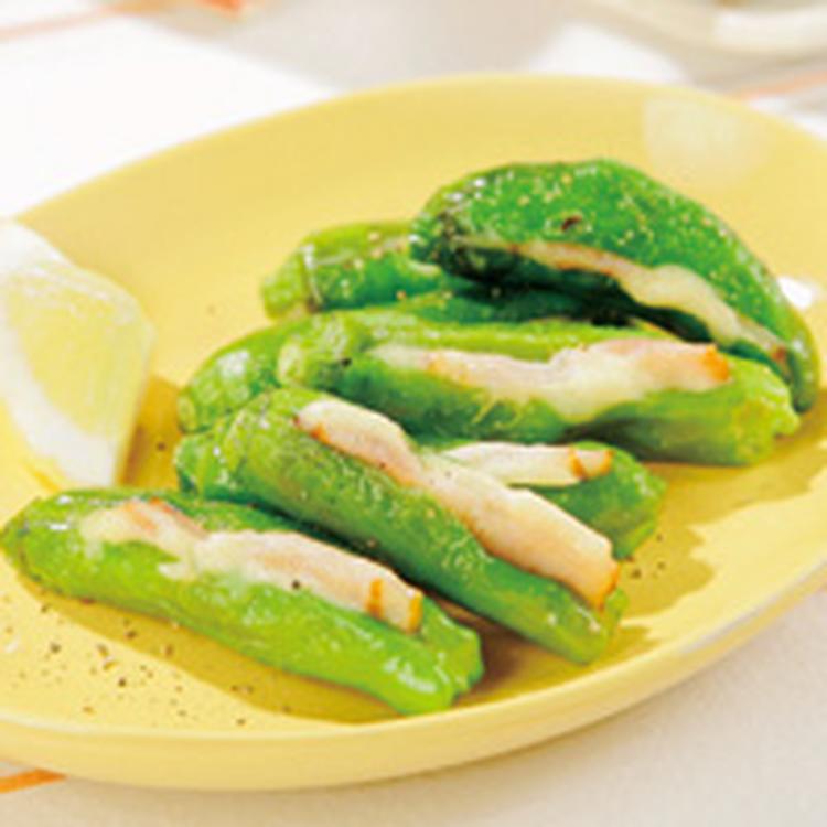 ししとうはヘタを残して縦に切り込みを入れる。ベーコンは5mm幅に切る。チーズは1枚を14枚に切る。