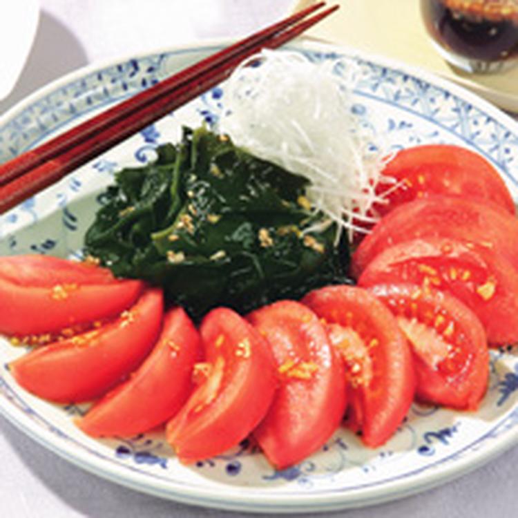 生わかめは水で洗って、食べやすい長さに切る。トマトは食べやすい大きさに切って冷蔵庫で冷やしておく。