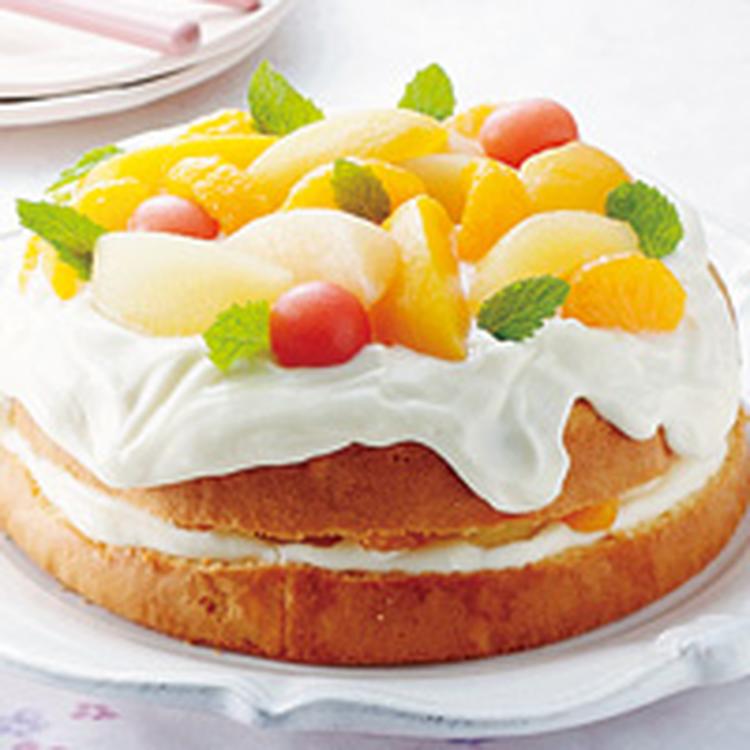 生クリームに分量のグラニュー糖(50g)を加えて8分立てにし、スポンジの下になる部分にたっぷりとのせる。シロップの水気をきった缶詰のフルーツをのせ、上になるスポンジを重ねる。