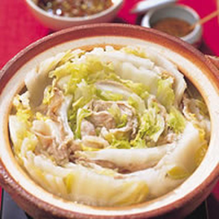 土鍋に白菜と豚肉を交互に重ね入れ、きれいな円形にする。塩を全体にふり、酒をまわしかけたらフタをして蒸し煮にする。(白菜から水分が出るので水は入れない)