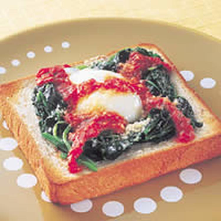 「十二穀ブレッド」6枚切りに市販のピッツァソースをぬり、ほうれん草と温泉卵をのせ、市販のピッツァソースを少しかけ、残りのチーズを振り掛け、オーブントースターで5分焼く。