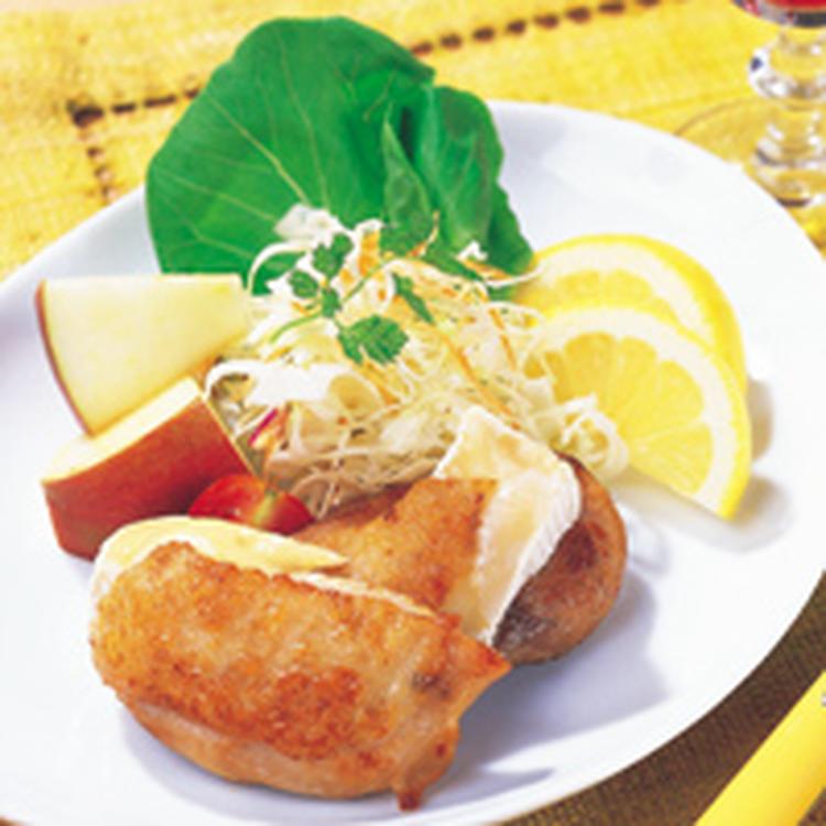 鶏肉は余分な脂肪を取り除き、1枚を4等分にする。皮と身の間に包丁を入れ、切り離さないように注意しながら、切込みを入れる。カマンベールは放射状に4等分に切る。