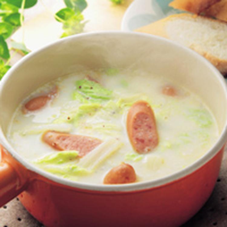 (3)に分量の牛乳を加える。(1)の白菜の葉、粒マスタードをスープで溶いて加えて沸騰させないように気をつけながら温める。