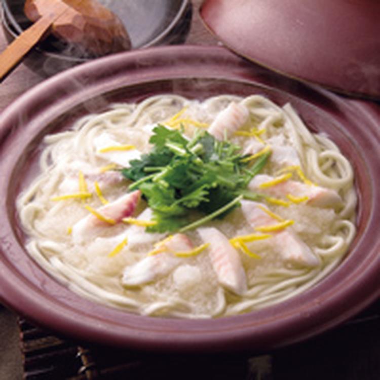 (4)の鍋が再び沸騰したら、鯛刺身をのせ、(1)の三つ葉、ゆずの皮をのせる。だしごと各々の器にとりわけ、好みでゆず胡椒を加えていただく。
