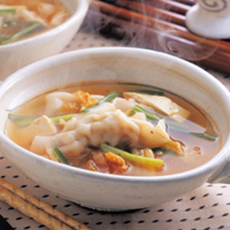 鍋にごま油と(1)を入れて熱し、香りが出てきたら分量の水、Aを加える。沸騰したらチルド餃子と(2)を加え、中火で5分煮る。