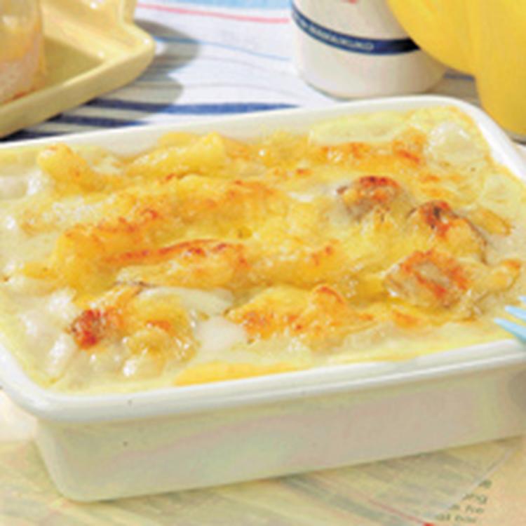 バターを塗った耐熱皿に入れ、表面にチーズを散らしてバターをちぎって適量のせる。200℃のオーブンで約15~18分焼き、よい焼き色がついたら取り出す。