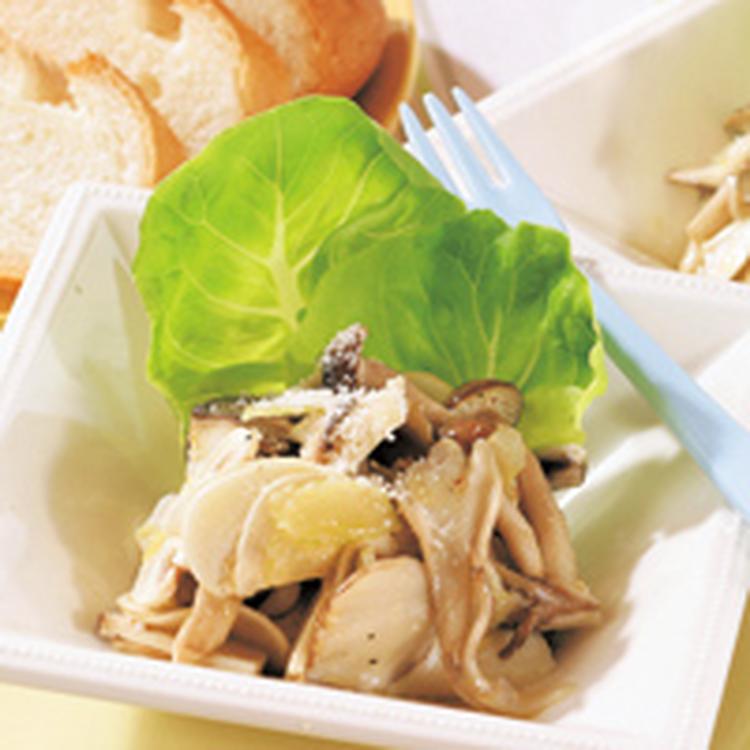 きのこ類は石づきを切り取り、しめじ、まいたけは小房に分ける。エリンギは長さを半分に切り、繊維にそって薄くスライスする。マッシュルームは薄くスライスし、レモン汁を全体にまぶしておく。セロリは筋を取りのぞき、みじん切りにする。