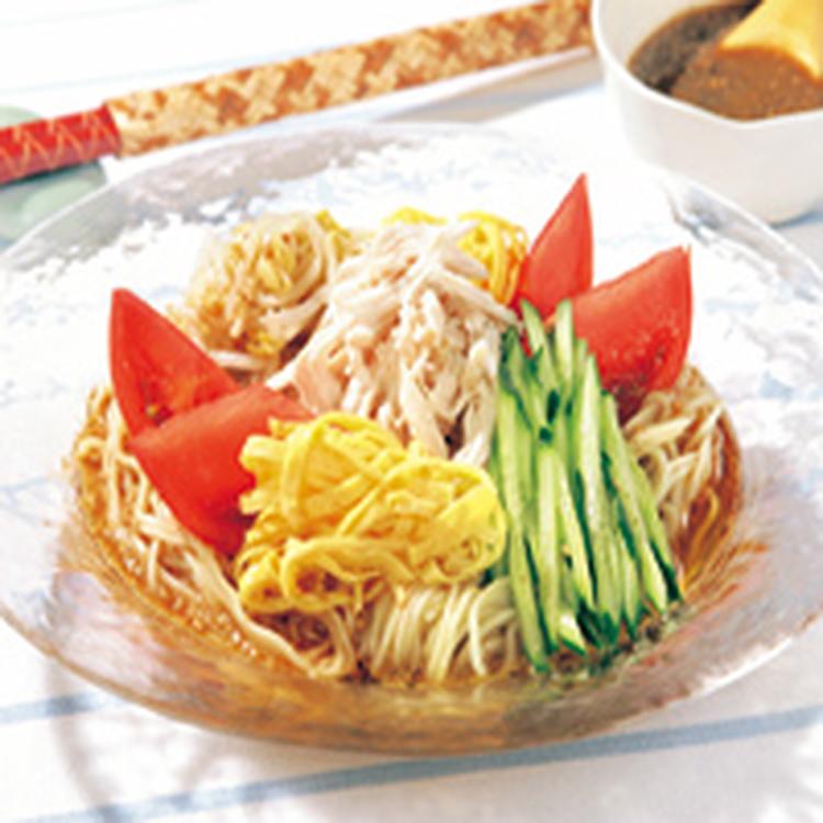 中華麺をたっぷりの熱湯で茹でてザルにあげ、流水で手早く洗って水気をきり、ごま油を少々まぶす。