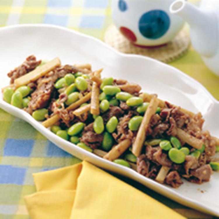 肉の色が変わったら(5)で取り出したごぼうを戻し、むき枝豆を加えて炒め合わせ、Bで調味する。