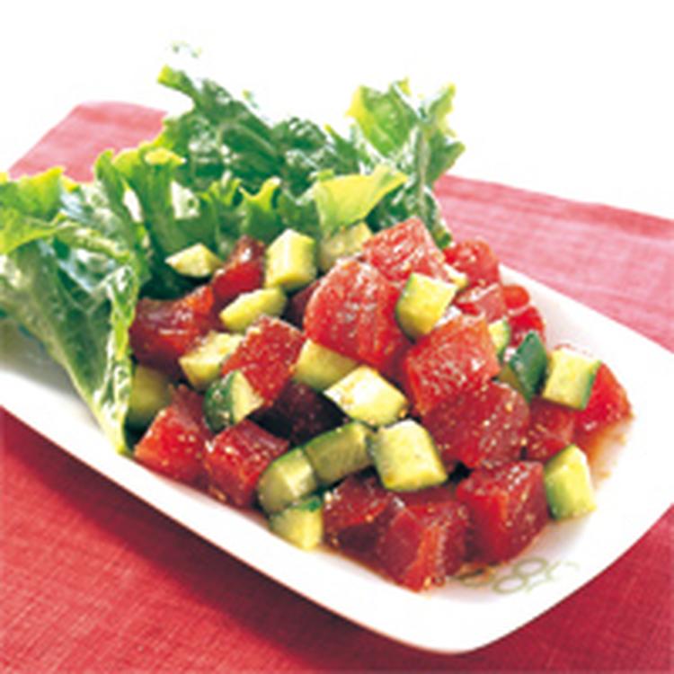 まぐろはぶつ切りにする。きゅうりは縦4等分に切り、1cmの長さに切る。