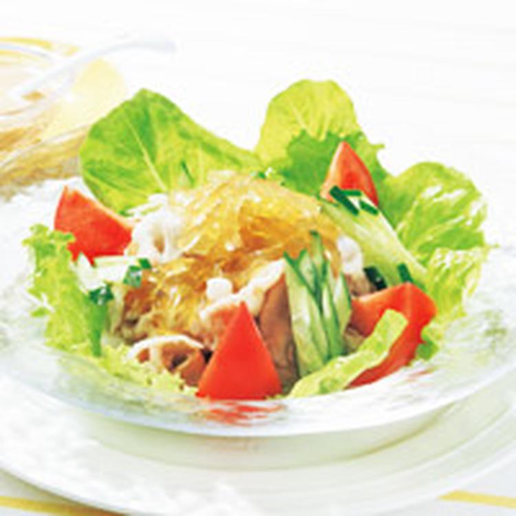 きゅうりは薄切りしてから細切りにし、サラダ菜とともに冷水にはなしてシャキッとさせ、水気をよくきる。トマトはくし型に切る。