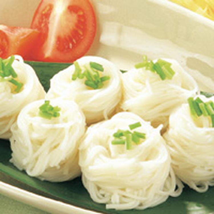 そうめんをザルにあげて水けをきり、箸にクルクルと巻きつけるようにしながら、器に盛りつける。(こうすると食べやすくなります。)