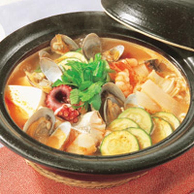土鍋に(1)で準備したあさりの汁と残りの水2カップを入れ、辛味噌ダレの半量を加えて混ぜる。 火にかけ、大根、白菜、ズッキーニを入れて煮る。やや火が通ってきたところで、 たら、えび、たこ、豆腐を加えて煮る。アクをすくい取り、残しておいた辛味噌ダレを加えて塩、こしょうで味をととのえる。