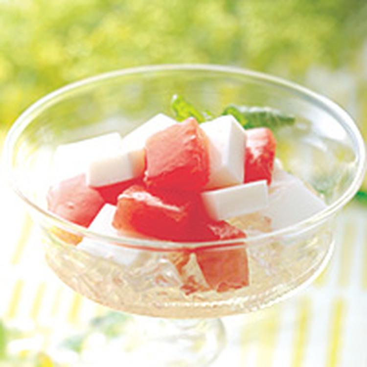 すいかは種を除き、身をくりぬく。この時、流れ出た果汁も捨てずにとっておく。ミキサーにかけてピューレ状にしてAを加え、1カップに足りなければ水を足しておく。