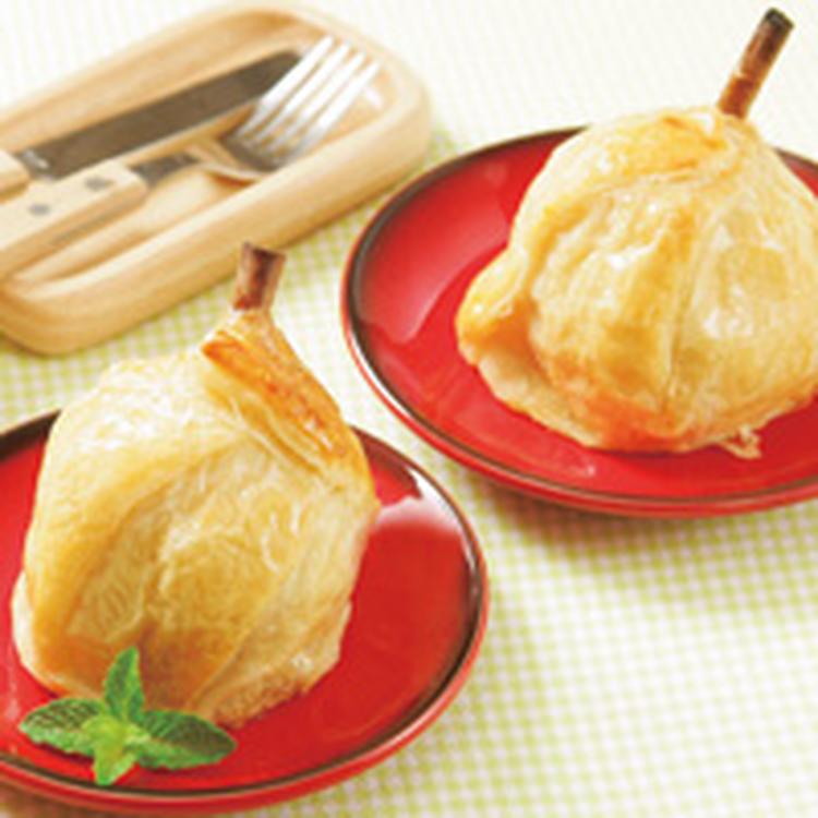 パイ生地で、りんごを包む。生地の重なる部分は卵白を塗ってのり代わりにし、貼り合わせる。