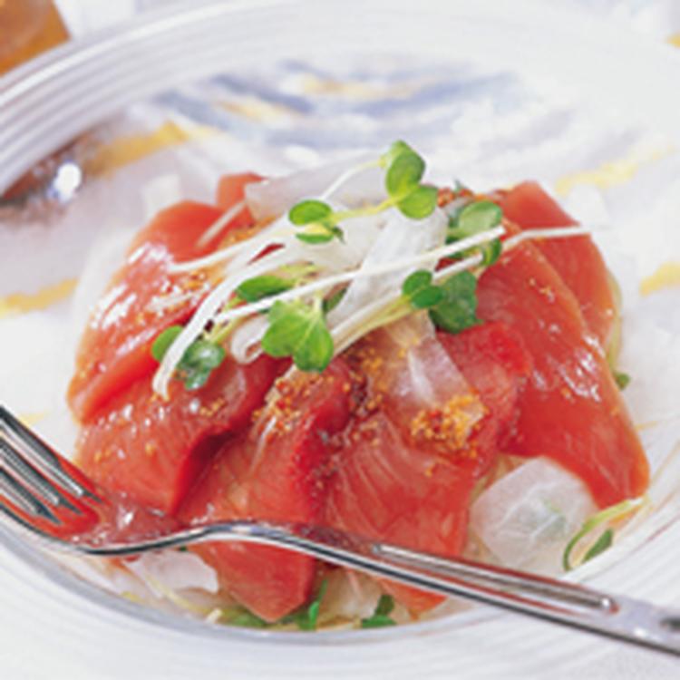 (1)の大根と貝割れ菜を少し残して、器にこんもりと盛る。かつおを薄く切り分け、たてかけるようにして盛り付け、残りの大根と貝割れ菜を上にのせる。