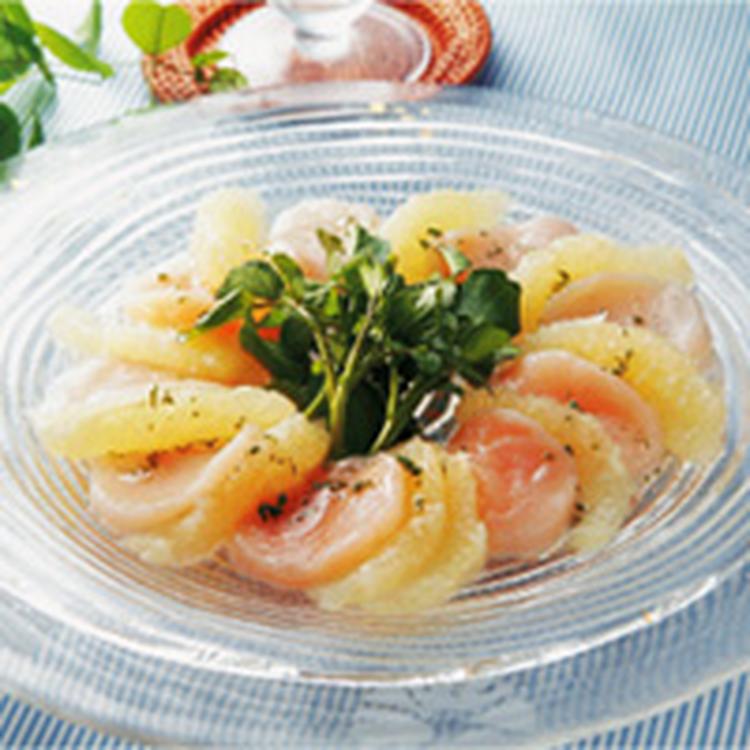 グレープフルーツは皮を削ぐようにして剥き、薄皮に沿って包丁を入れ、実だけを取り出す。厚みを2等分にし、冷蔵庫で冷やしておく。