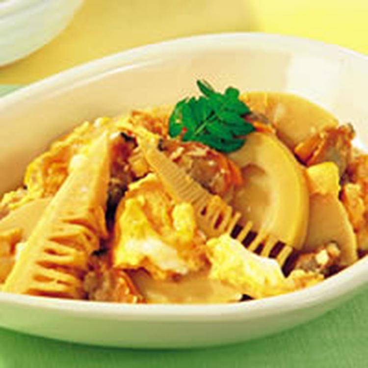 鍋に煮汁の材料を入れて中火にかけ、煮立ったらたけのこを加えて弱火にする。5分ほど煮てあさりを加え、中火でひと煮立ちさせたら溶き卵をまわし入れてふたをする。