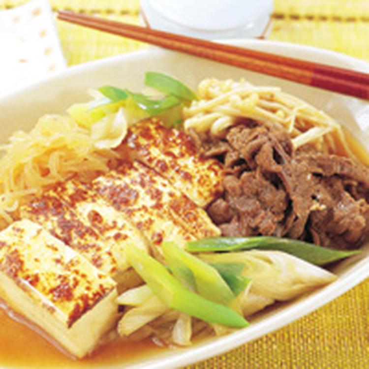 豆腐は8等分に切る。牛肉は4~5cm長さに切る。長ねぎは斜め切りにし、えのきは石づきを切り落として食べやすくほぐす。しらたきは熱湯でさっと茹で、水気をきって食べやすい長さに切る。