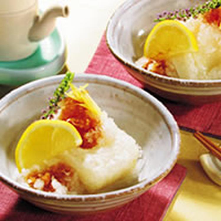 半月切りにした柚子をのせ、残りの大根おろしをかけてしょうゆを適量おとす。