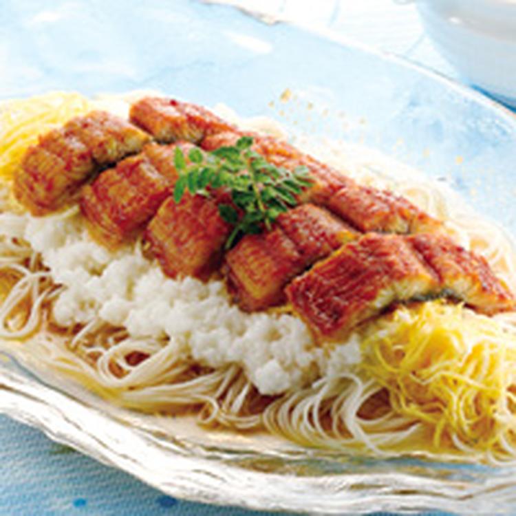 うなぎ蒲焼は1.5cm幅に切り、耐熱皿に入れる。酒をふり、ラップをかけて電子レンジで1分間加熱する。