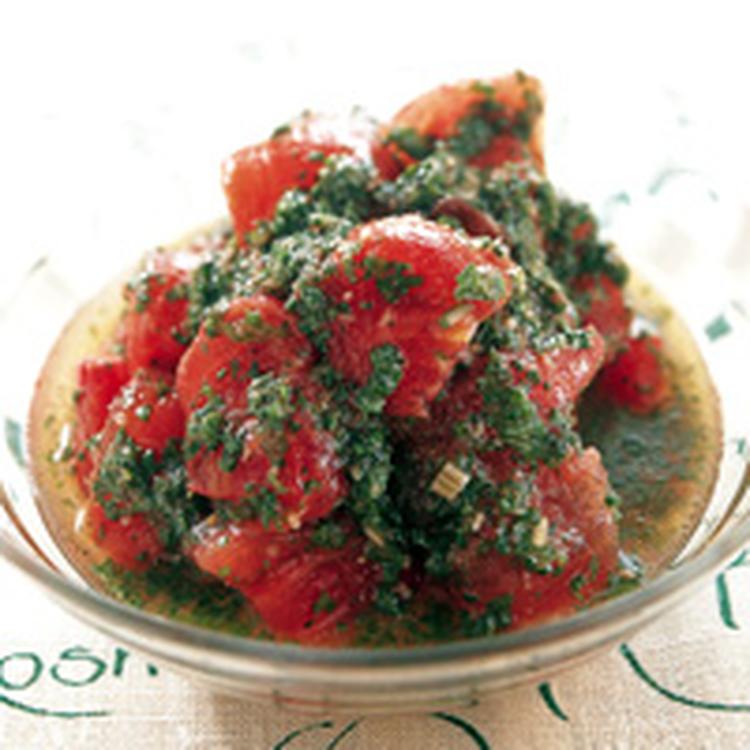 トマトをボウルに入れ、オリーブオイルをまわしかけ、全体を和える。塩、こしょう、にんにく、バジル、パセリを加え、全体を混ぜ合わせて冷蔵庫で冷やす。