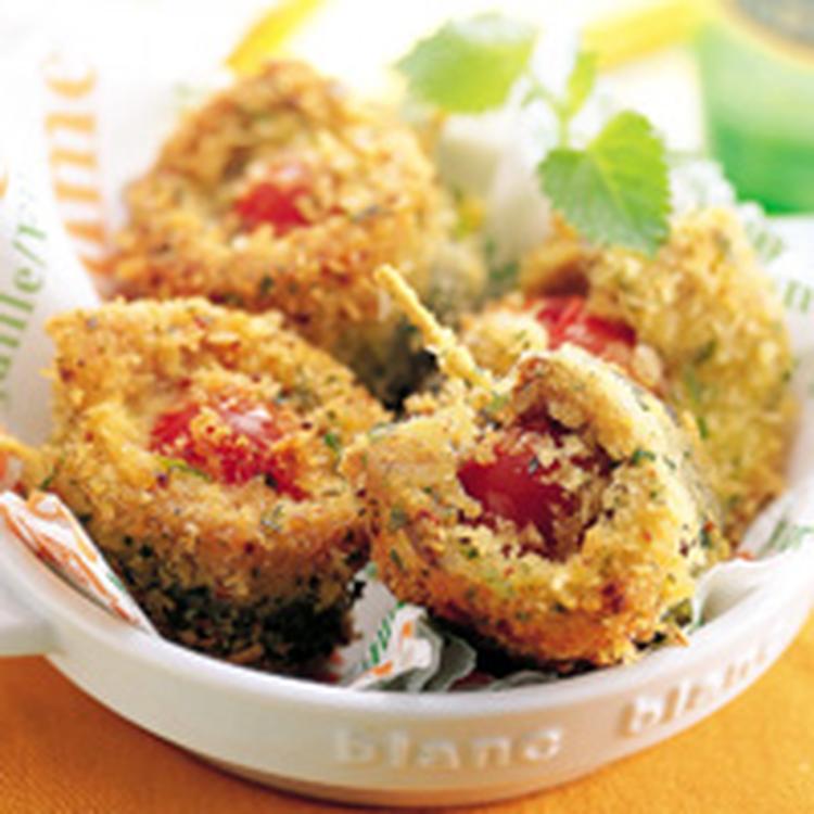 (1)のさんまに小麦粉を薄くまぶし、プチトマトに巻いて外れないように端を楊枝でとめる。溶き卵にくぐらせ、(2)のハーブパン粉をつける。