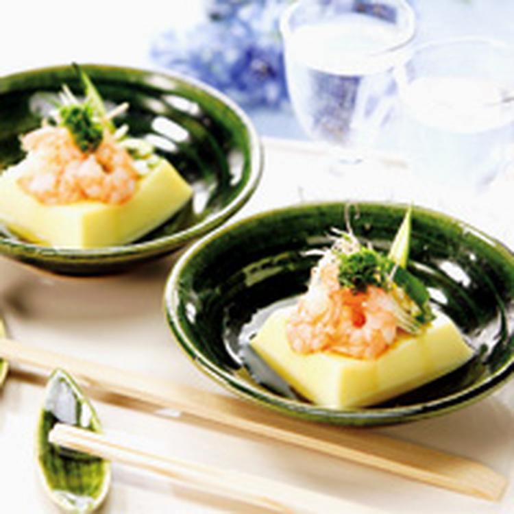 器に市販の卵豆腐を盛り付け、(1)、(2)の食材を彩り良く飾り、タレを回しかける。