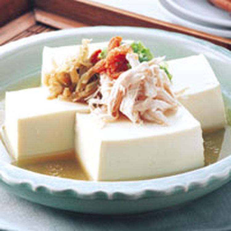(1)の豆腐は1丁を4等分に切る。1/4量を器に盛り、(5)の具材を1/4量ずつ盛りつける。 (4)の冷たいだしを干しえびごとたっぷりかける。残りも同様に盛りつける。お好みでごま油少量をまわしかけていただく。
