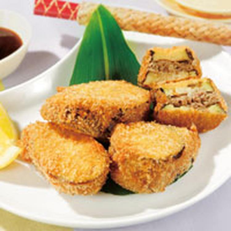 (3)に小麦粉、溶き卵、パン粉の順で衣をつけ、中温に熱した揚げ油でキツネ色になるまで揚げる。油をよくきって器に盛り付け、レモンを添える。