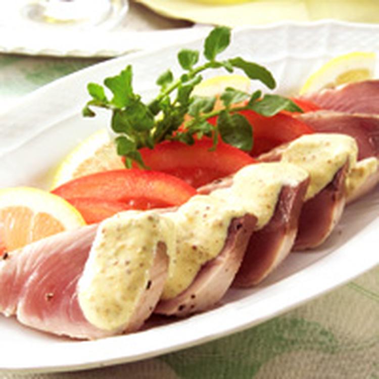 (3)のかつおを食べやすい大きさに切る。器に(4)とかつおを彩りよく並べ、(5)を添える。食べる直前に(6)をかけ、レモンを絞っていただく。