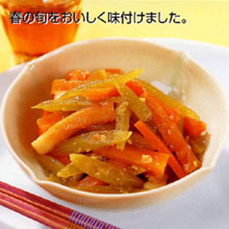 (2)に調味料をすべて加え、ふきも加えて煮る。人参がやわらかくなったら、水溶き片栗粉でかるくとろみをつけて器に盛りつける。