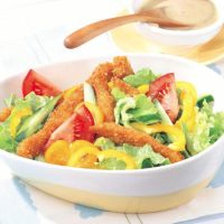 野菜は食べやすく切って冷水にはなし、シャキッとさせる。水気をよくきって彩りよく盛り合わせ、(3)を添える。食べる直前にドレッシングをまわしかける。