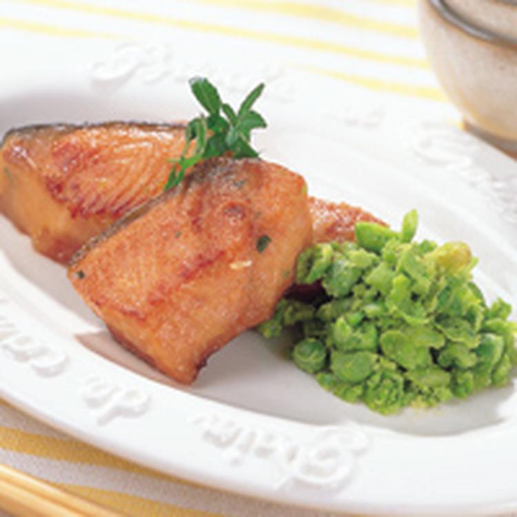 器に鮭を盛りつけ、グリーンピースを添えて木の芽をあしらう。