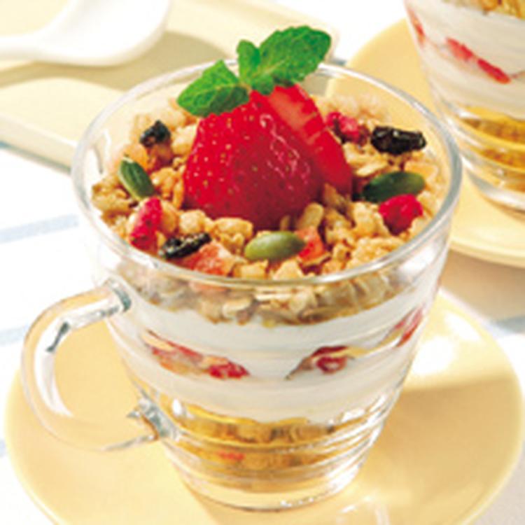 残りのいちご4個を縦半分にカットし、それぞれグラスの真ん中に少しずらしてのせ、周りにグラノーラ大さじ1~2を敷きつめる。仕上げにあればミントの葉を飾る。