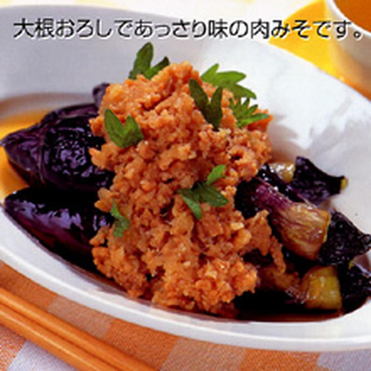 揚げたなすを器に盛り、おろしそぼろをたっぷりと汁ごとかける。仕上げに大葉を小さくちぎって散らす。