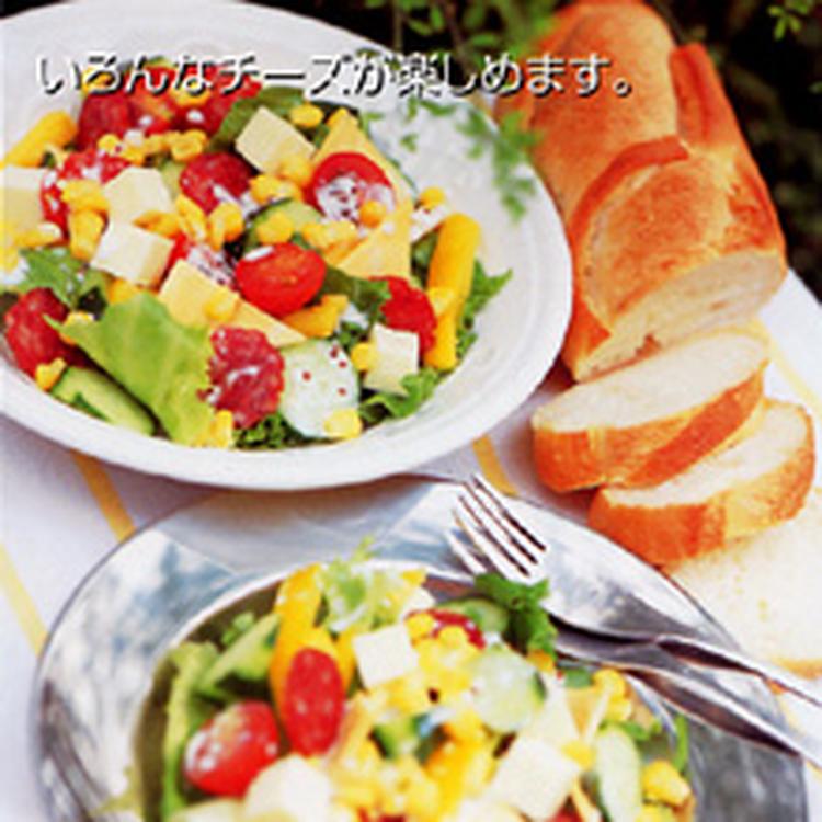 野菜とサラミ、チーズをざっくりとあえて器に盛る。コーン、プチトマトを散らし、食べる直前にドレッシングをかける。