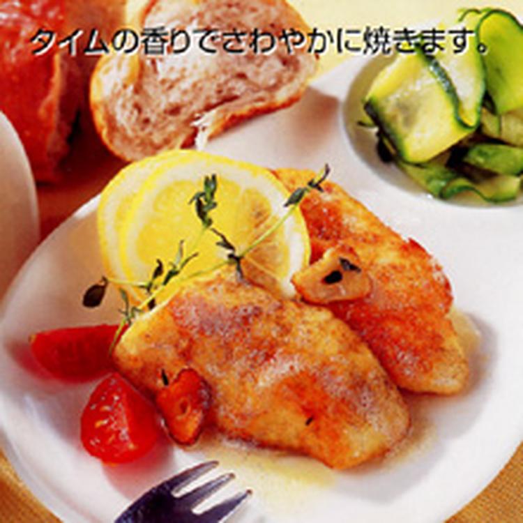 鯛を取り出したフライパンでズッキーニをしんなりと炒め、塩、こしょうで調味する。鯛とズッキーニを器に盛りつけ、レモン、タイムを添える。