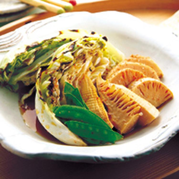 春キャベツはくし切り、ゆでたけのこは穂先と根元に分ける。穂先は8等分のくし形切り、根元は食べやすい大きさに切る。きぬさやは筋をとる。