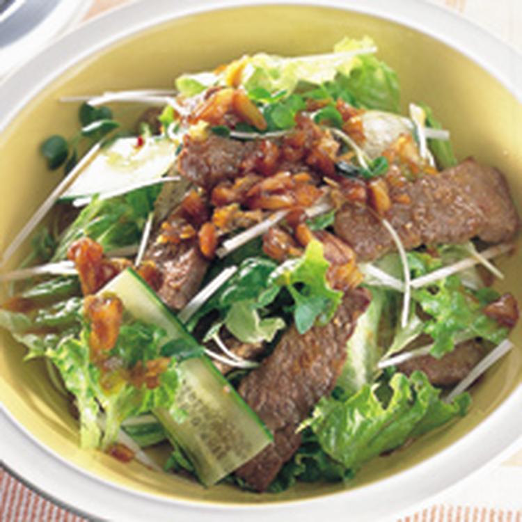 フライパンにサラダ油を入れて中火で熱し、牛肉を入れて両面を焼く。器に野菜、牛肉を盛りつけ、キムチソースをかけて白ごまをふる。