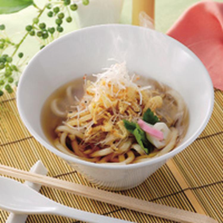 たっぷりの熱湯で麺を茹で、湯切りして器に入れ、ひと煮立ちさせたBのだし汁を注ぎ、(2)を上に盛る。