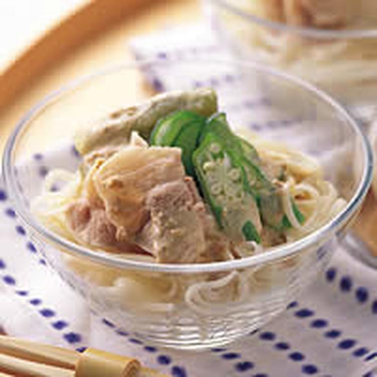 おくらはへたを包丁でむき、塩を加えた熱湯でさっと茹で、ざるにあげ、2cm幅くらいの斜め切りにする。同じ湯で食べやすい大きさに切った豚こま切れ肉を茹でる。
