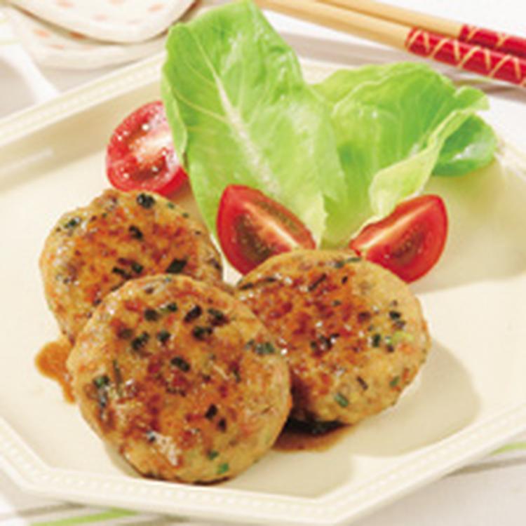 ボウルに(1)と(2)、A(しょうが汁、溶き卵、パン粉、塩、こしょう)を加えて粘り気が出るまでよく混ぜ合わせる。6等分にし、平たい小判型にまとめる。