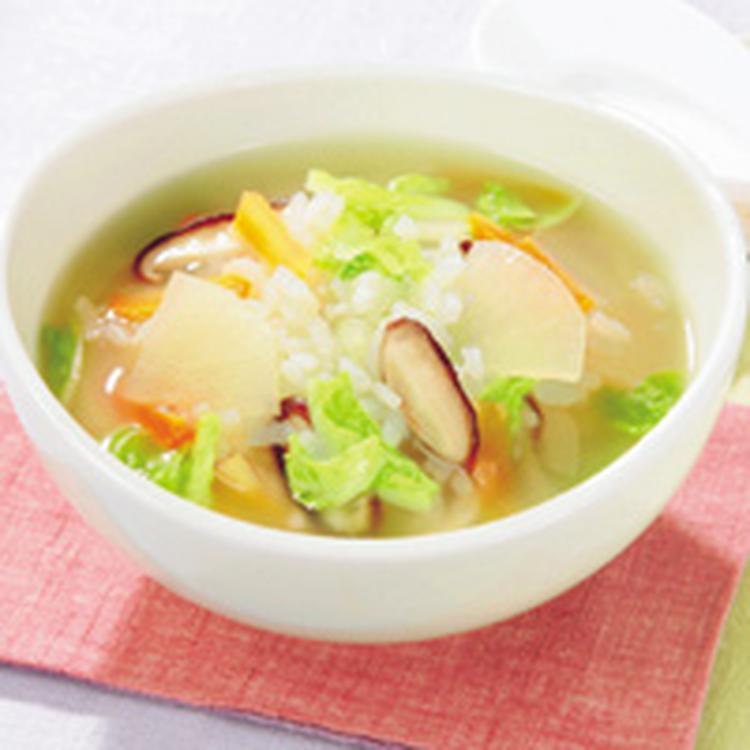 ご飯を加えてさっと煮、塩で味をととのえて器に盛る。