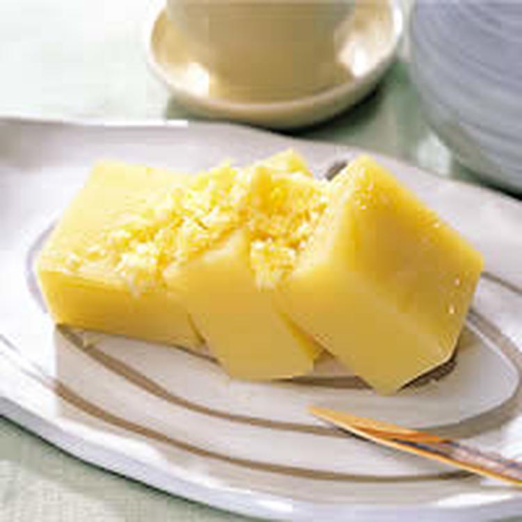 栗の甘露煮をおろし金などですって、ポロポロの状態にする。(6)が固まったら型から出して切り分け、すりおろした栗を表面にちらす。