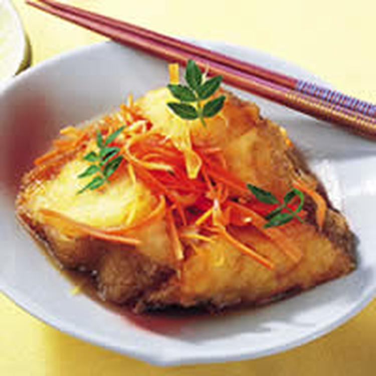 揚げ油を中温に熱し、かれいをこんがりと揚げる。油をよくきり、熱いうちに(2)のつけダレに加える。器に盛りつけ、あれば木の芽をあしらう。
