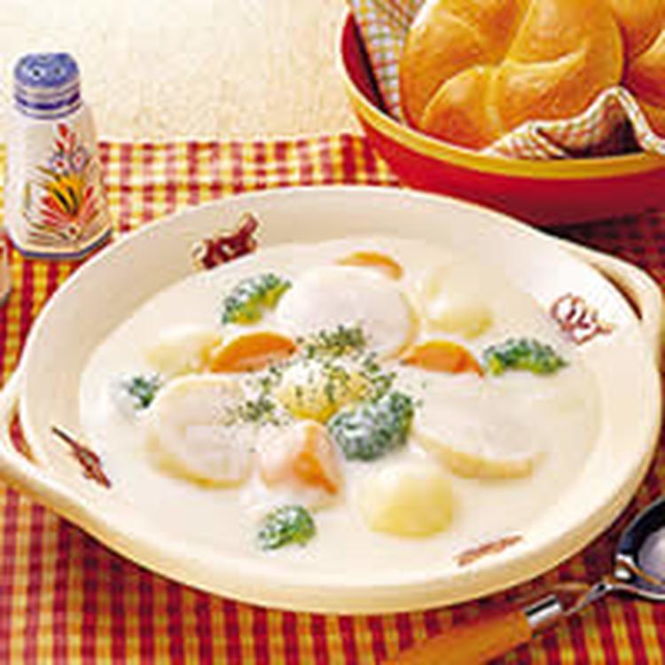 (1)のブロッコリー、(2)のほたて貝柱、牛乳を加えてひと煮立ちさせる。※ブロッコリ-の茎の部分は根元の固い部分は除いて薄きりにし、ゆでて利用してもよい。